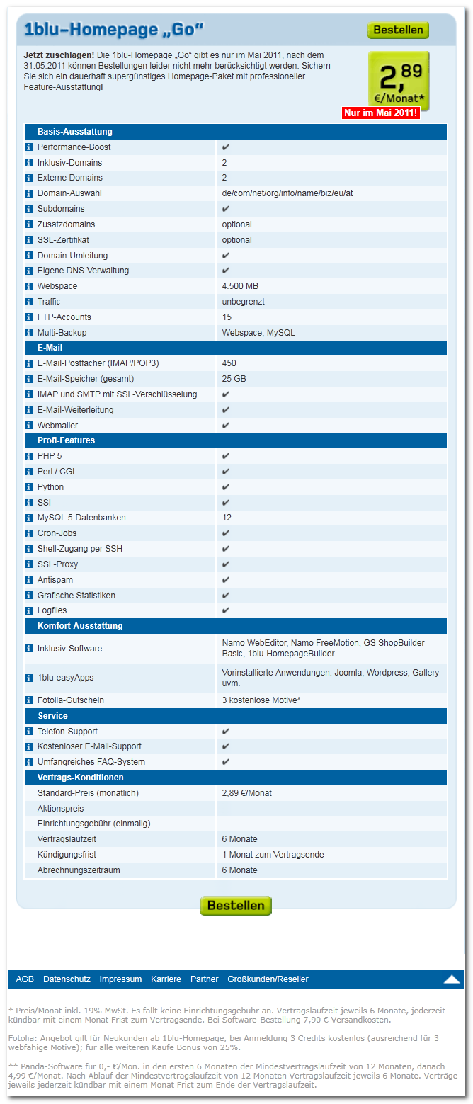 1blu - Homepage Go (05/2011) 2,89 Euro / monatlich 4,90 Euro / monatlich