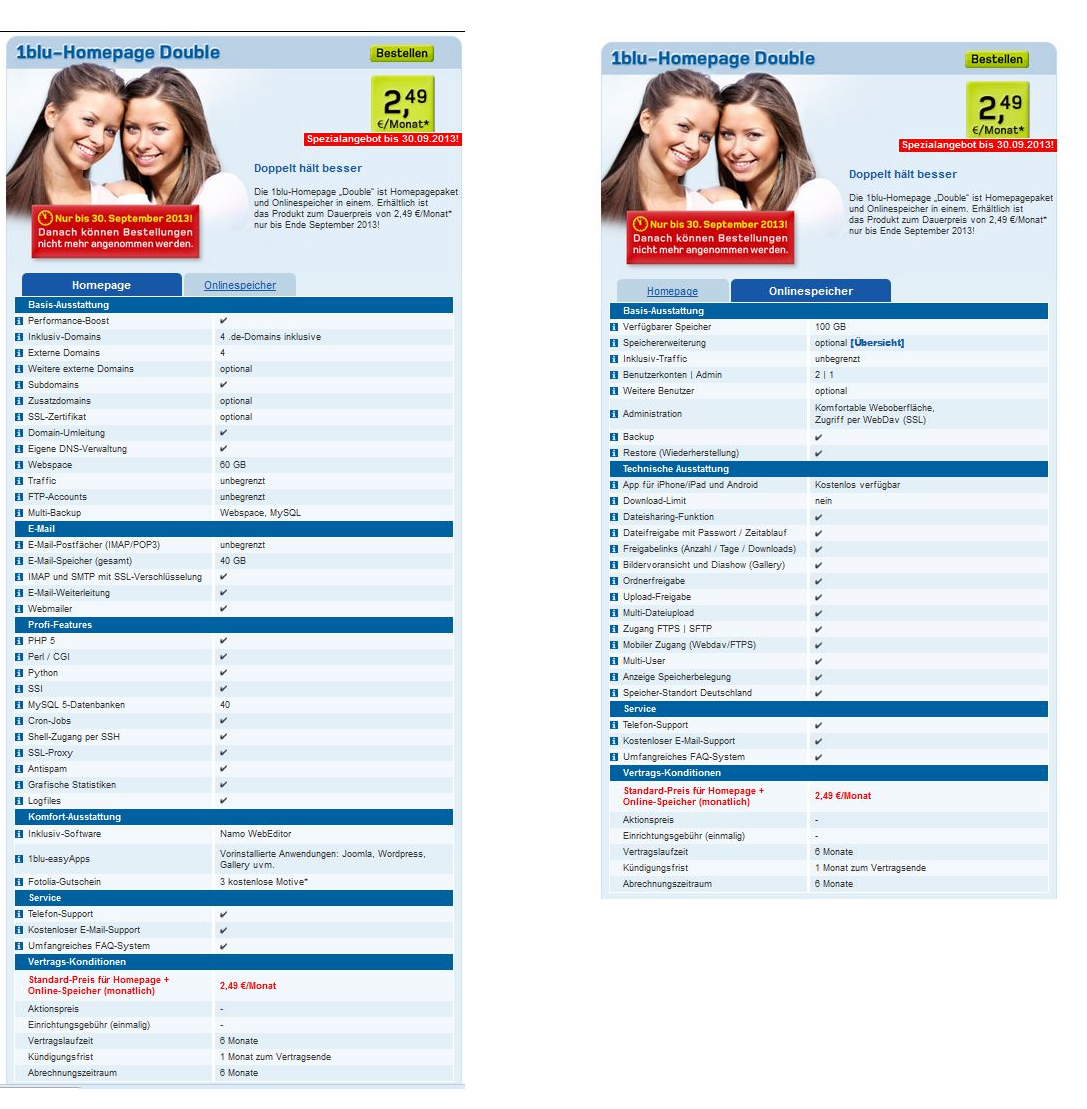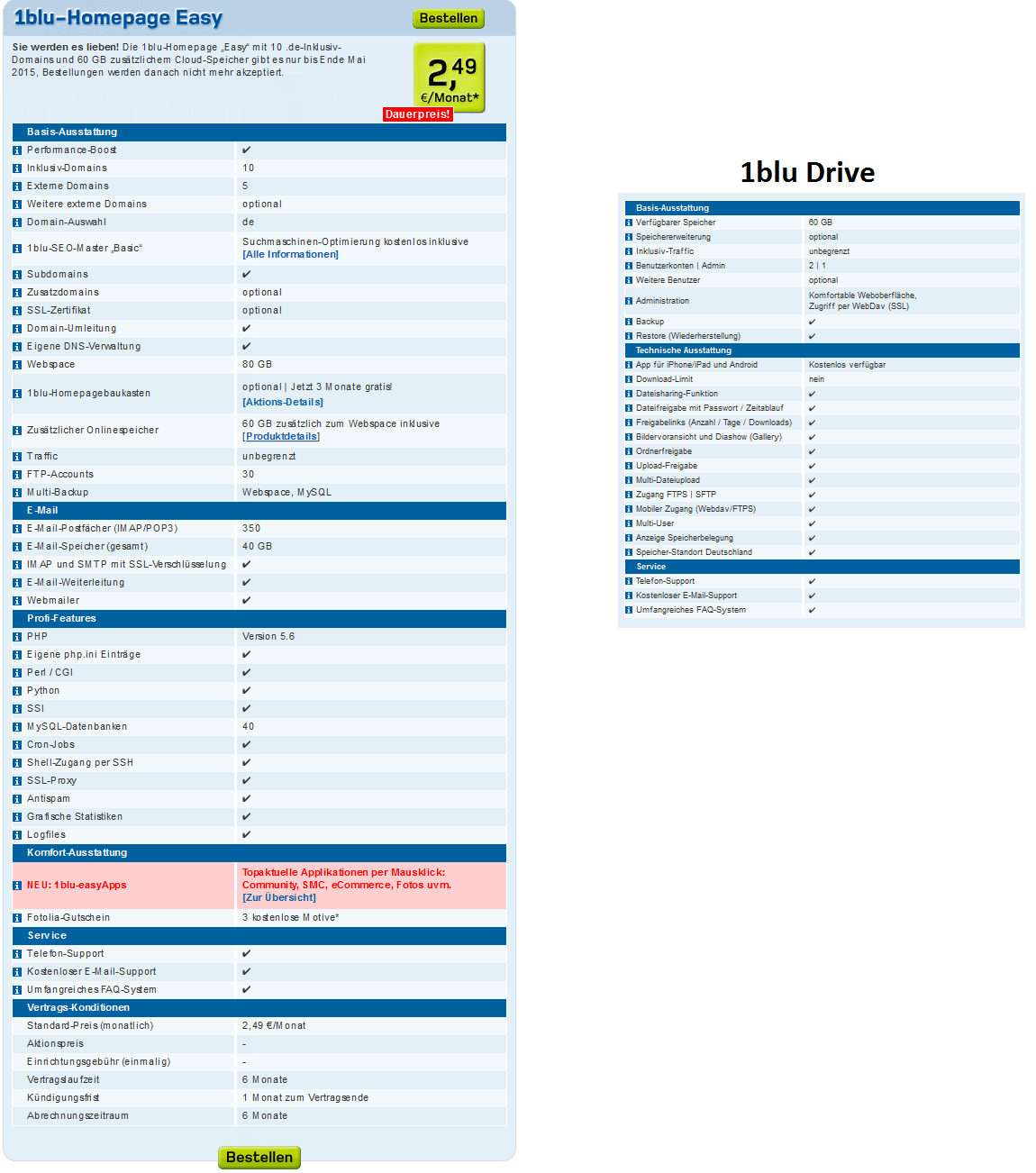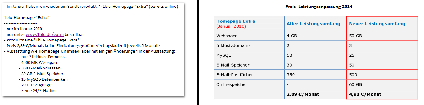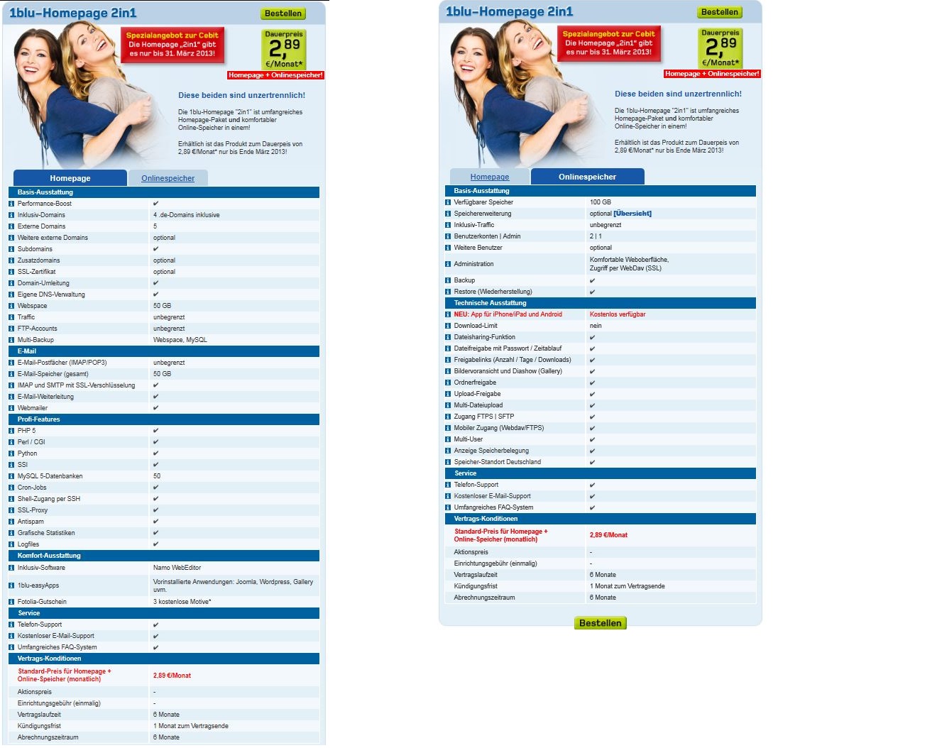 1blu - Homepage Extra (01/2010) 2,89 Euro / monatlich 4,90 Euro / monatlich (2014)