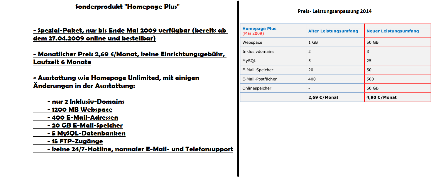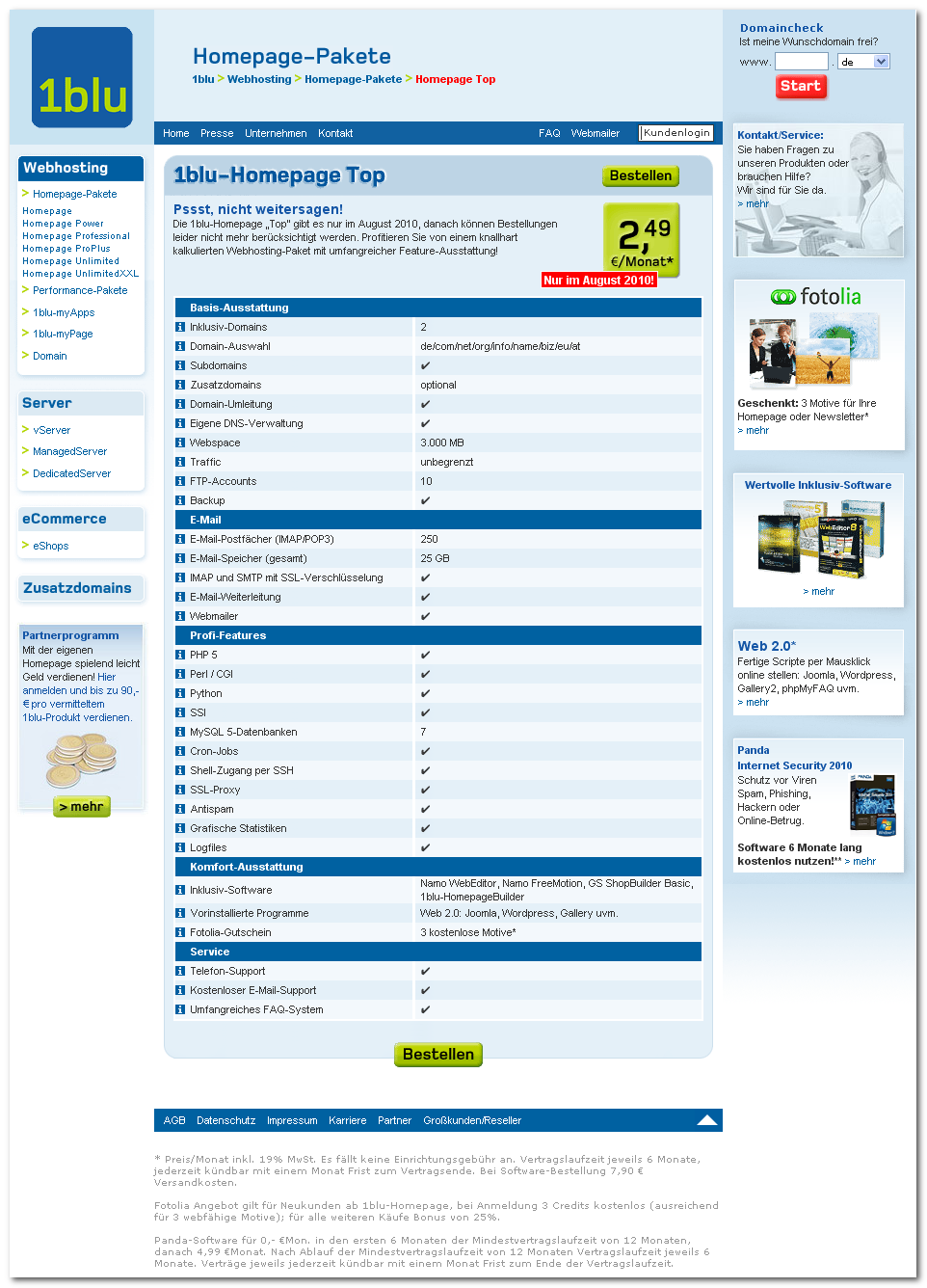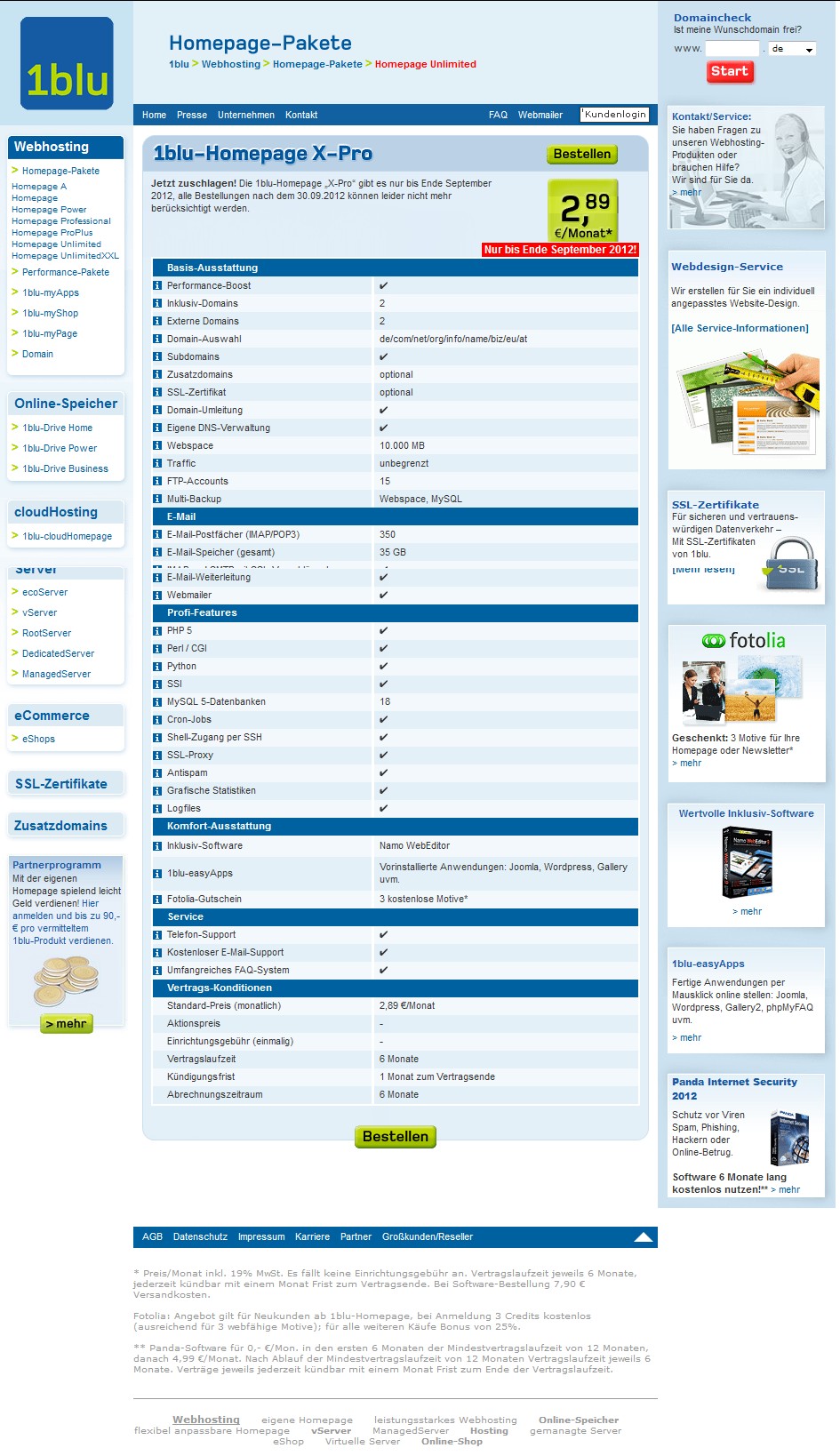 1blu - Homepage Extra (01/2010) 2,89 Euro / monatlich 4,90 Euro / monatlich (2014)