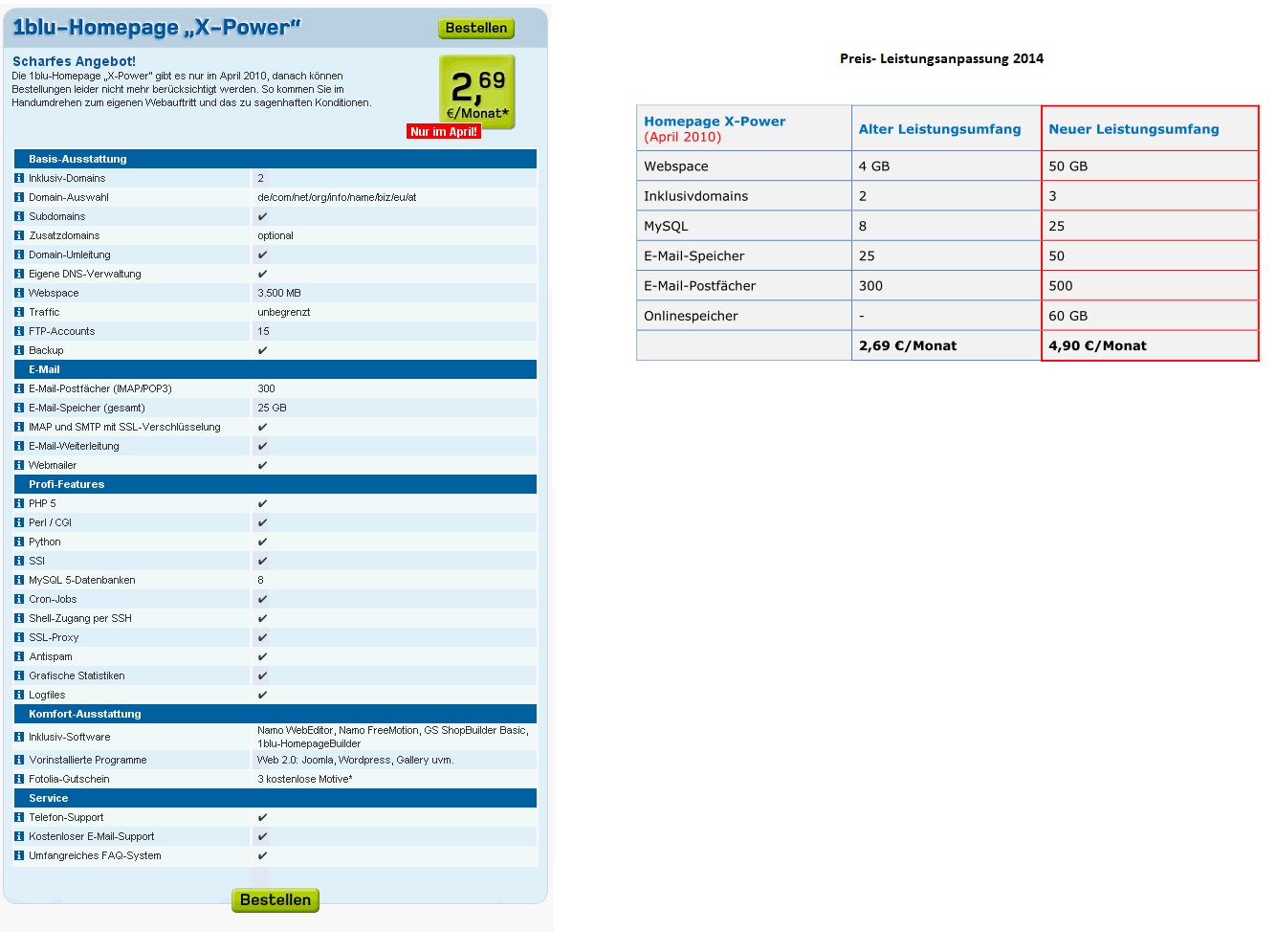 1blu - Homepage X-Power (04/2010) 2,69 Euro / monatlich 4,90 Euro / monatlich (2014)
