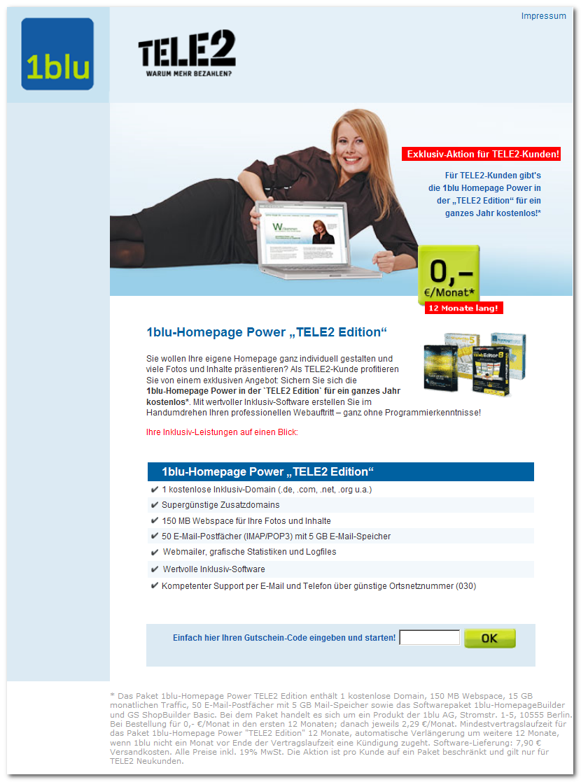 1blu - Homepage Power "Tele 2 Edition" (09/2010) 2,29 Euro / monatlich
