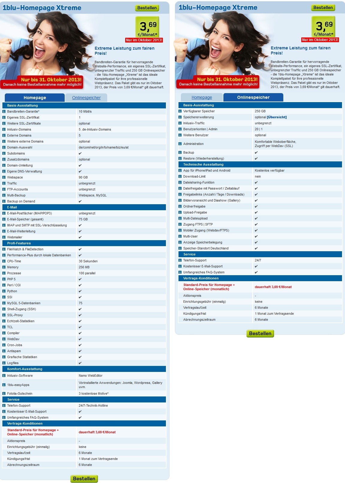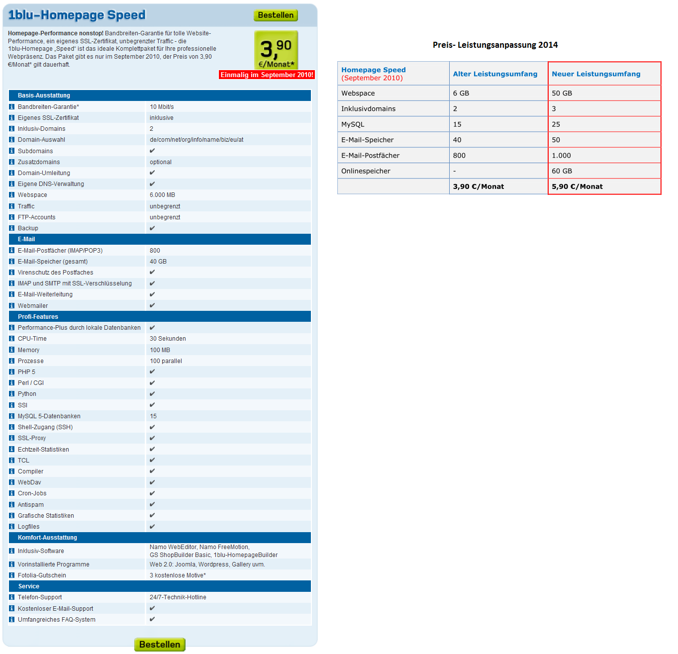 1blu - Homepage Speed (09/2010) 3,90 Euro / monatlich 5,90 Euro / monatlich (2014)