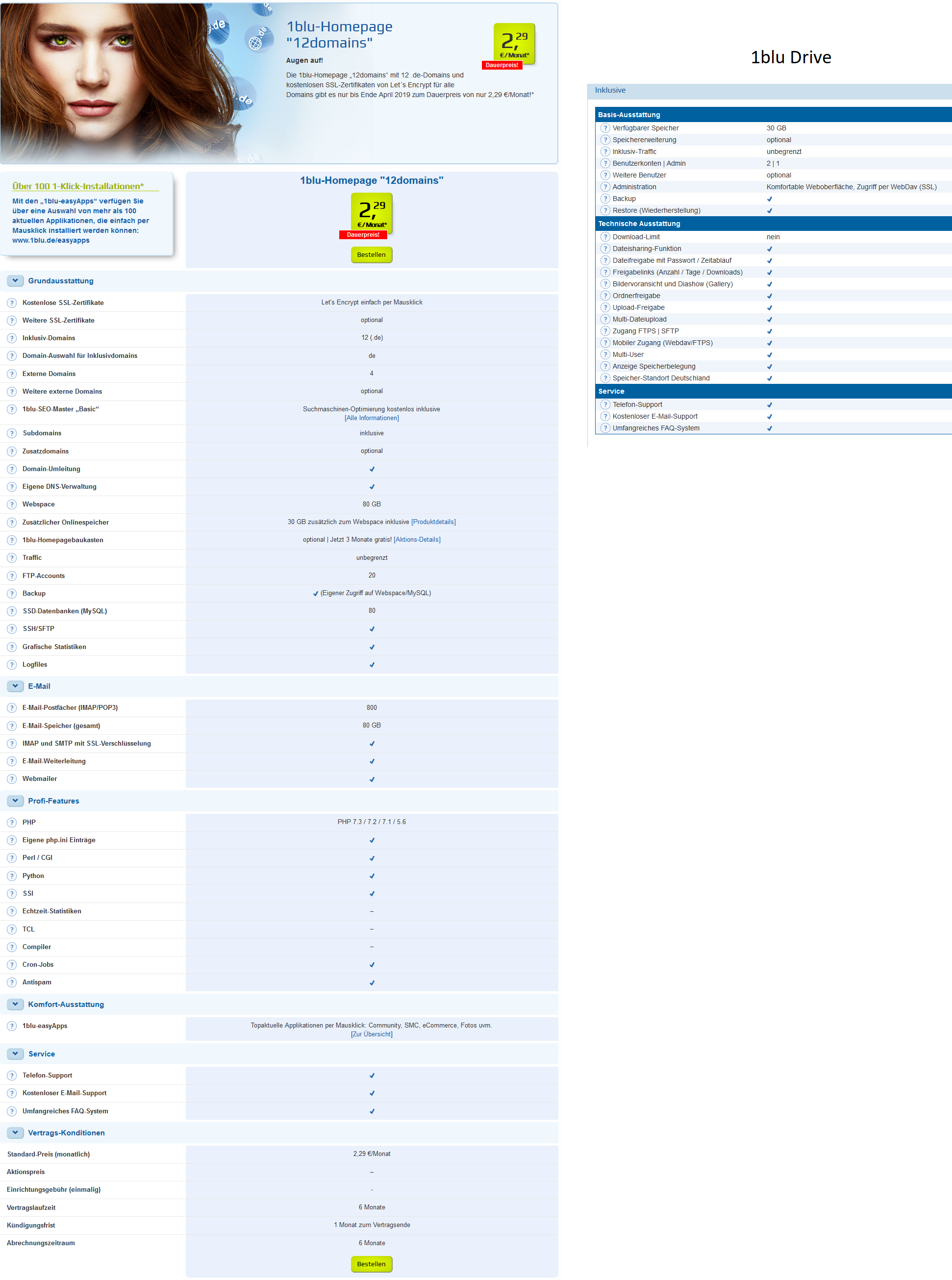 1blu Homepage "12domains" (04/2019) 2,29 Euro / monatlich