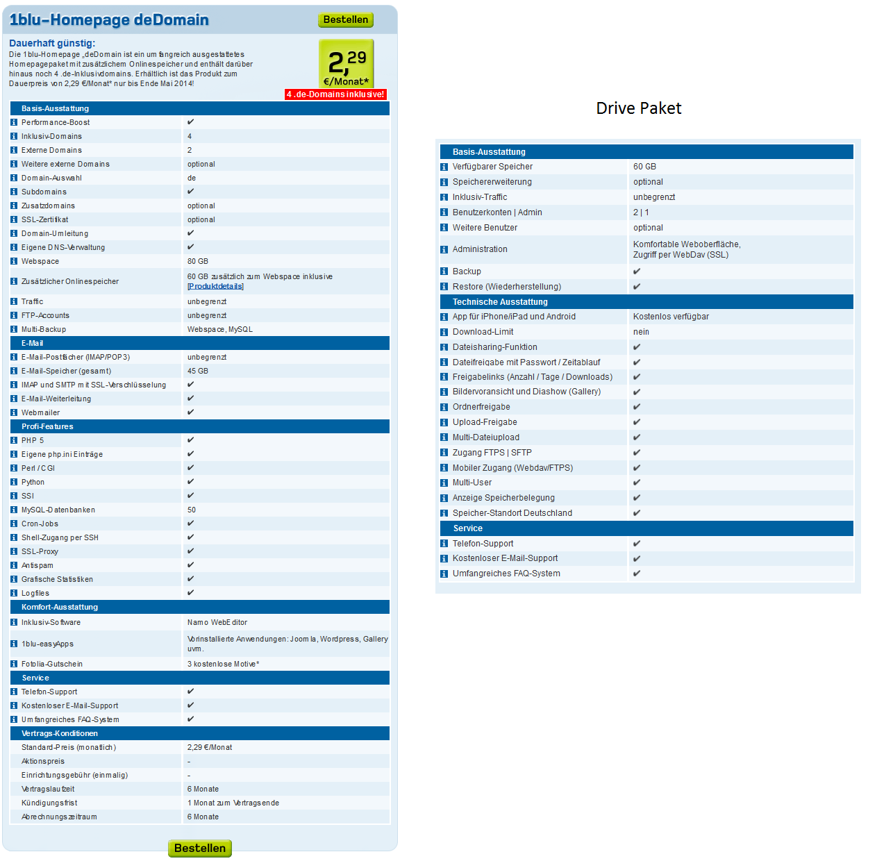 1blu Homepage "deDomain" (05/2014) 2,29 Euro / monatlich