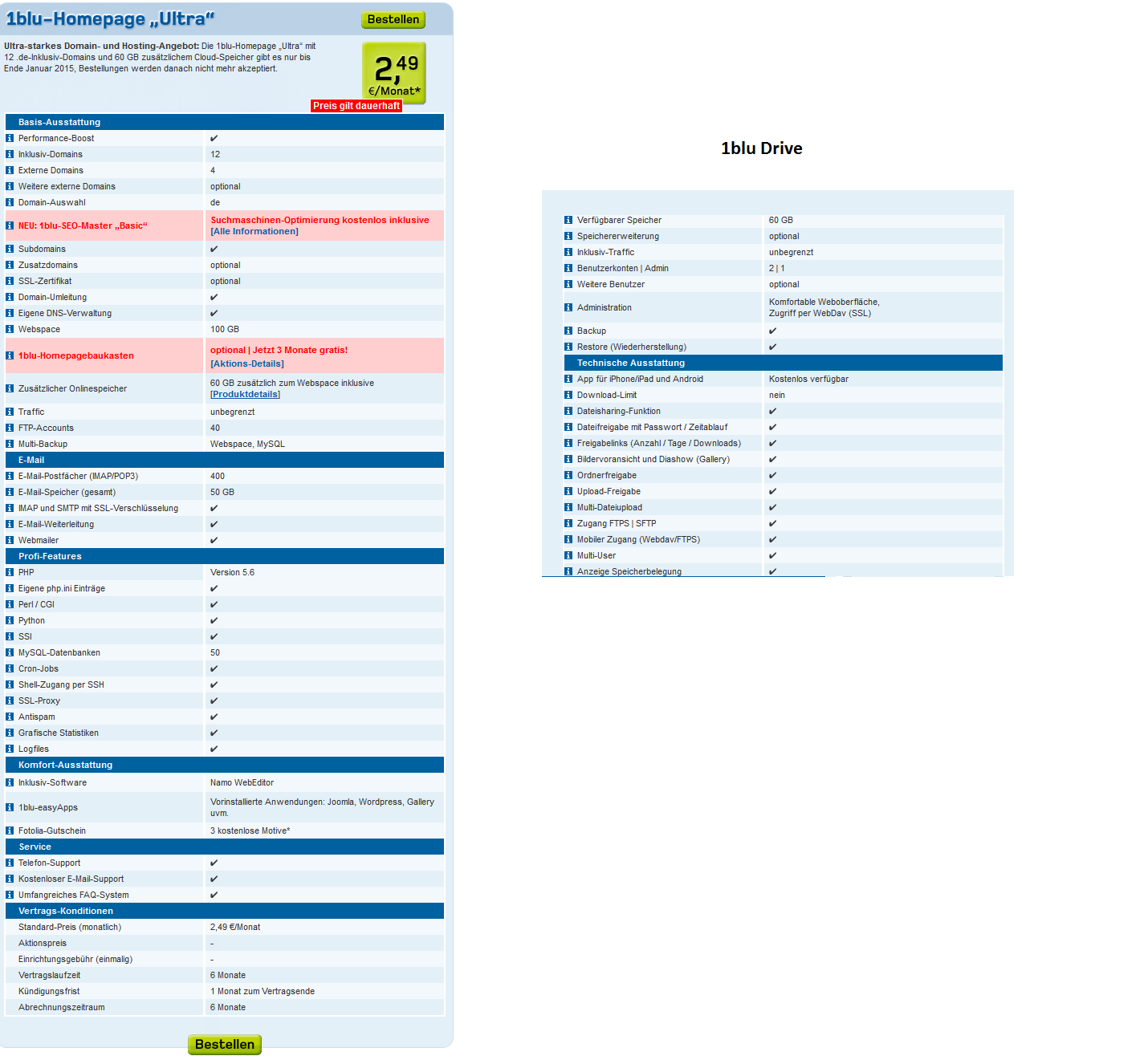 1blu Homepage "Ultra" (01/2015) 2,49 Euro / monatlich